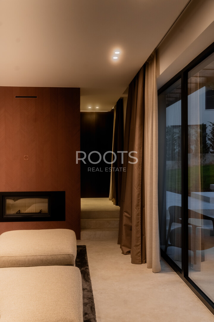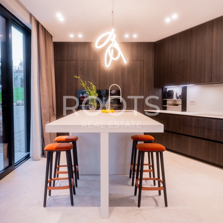 Vanjski prostor jednako je impresivan – uređena okućnica s mediteranskim biljem nudi lounge zonu s kaminom, bazen površine 37 m² s rasvjetom i masažnim mlaznicama, kao i veliku terasu s roštiljem, sudoperom i radnom plohom. Poseban arhitektonski detalj čine dizajnerske betonske stepenice koje se elegantno uklapaju u dvorišni prostor.