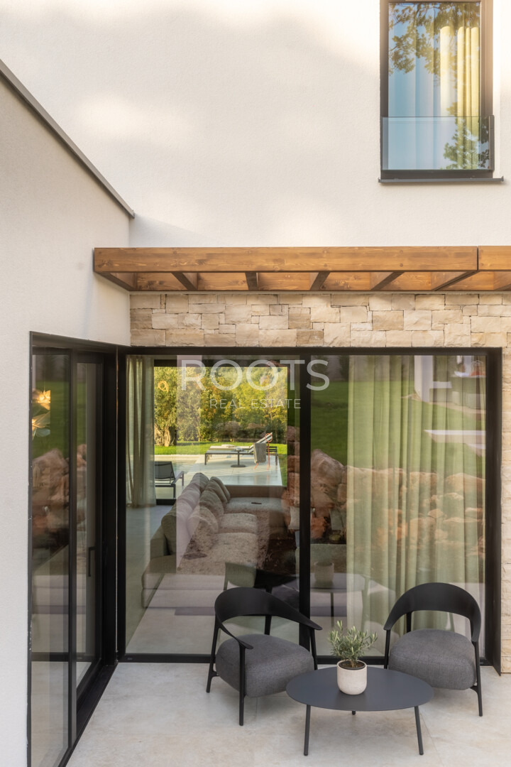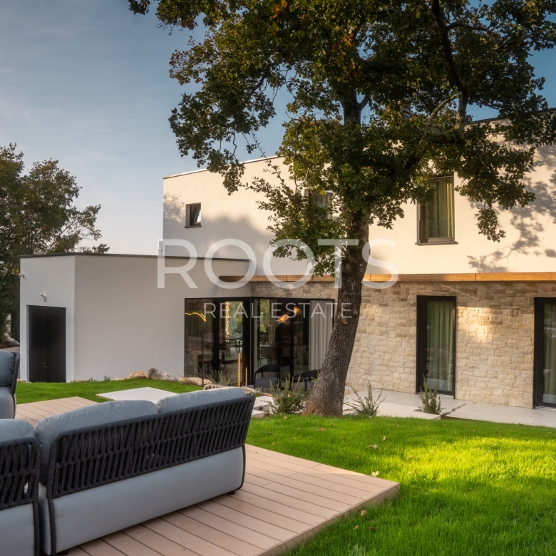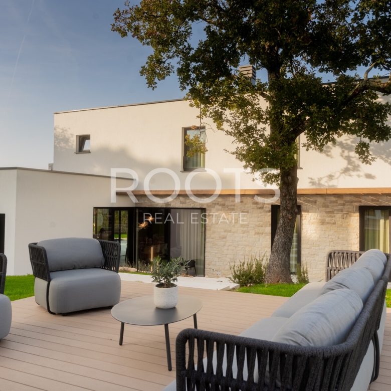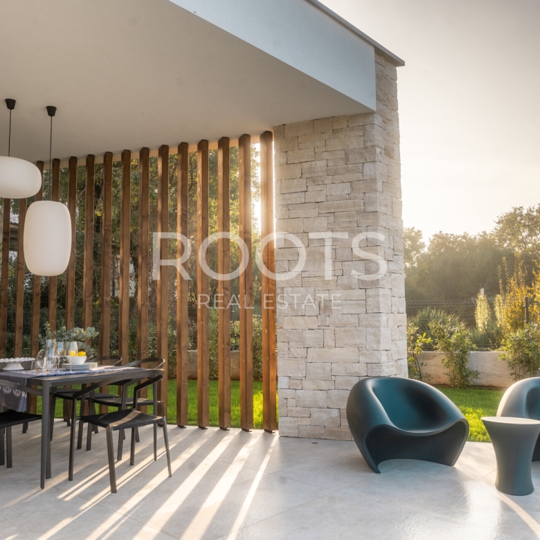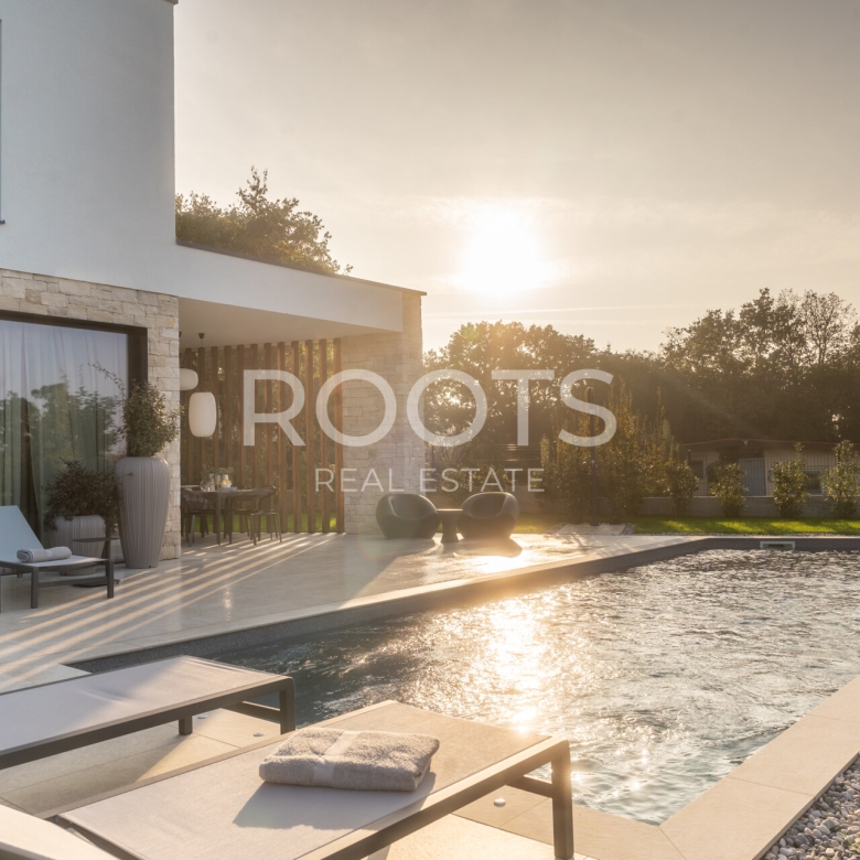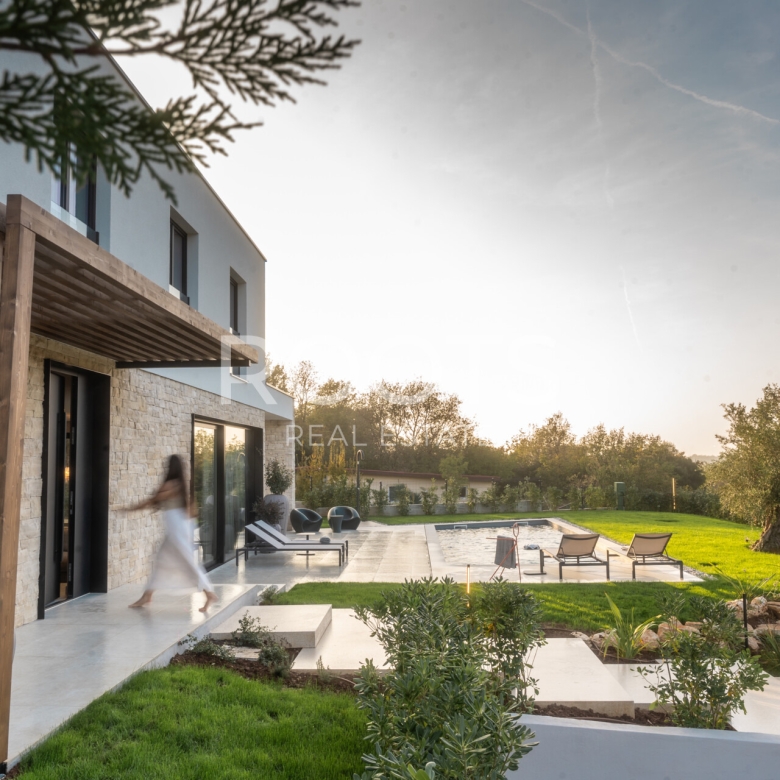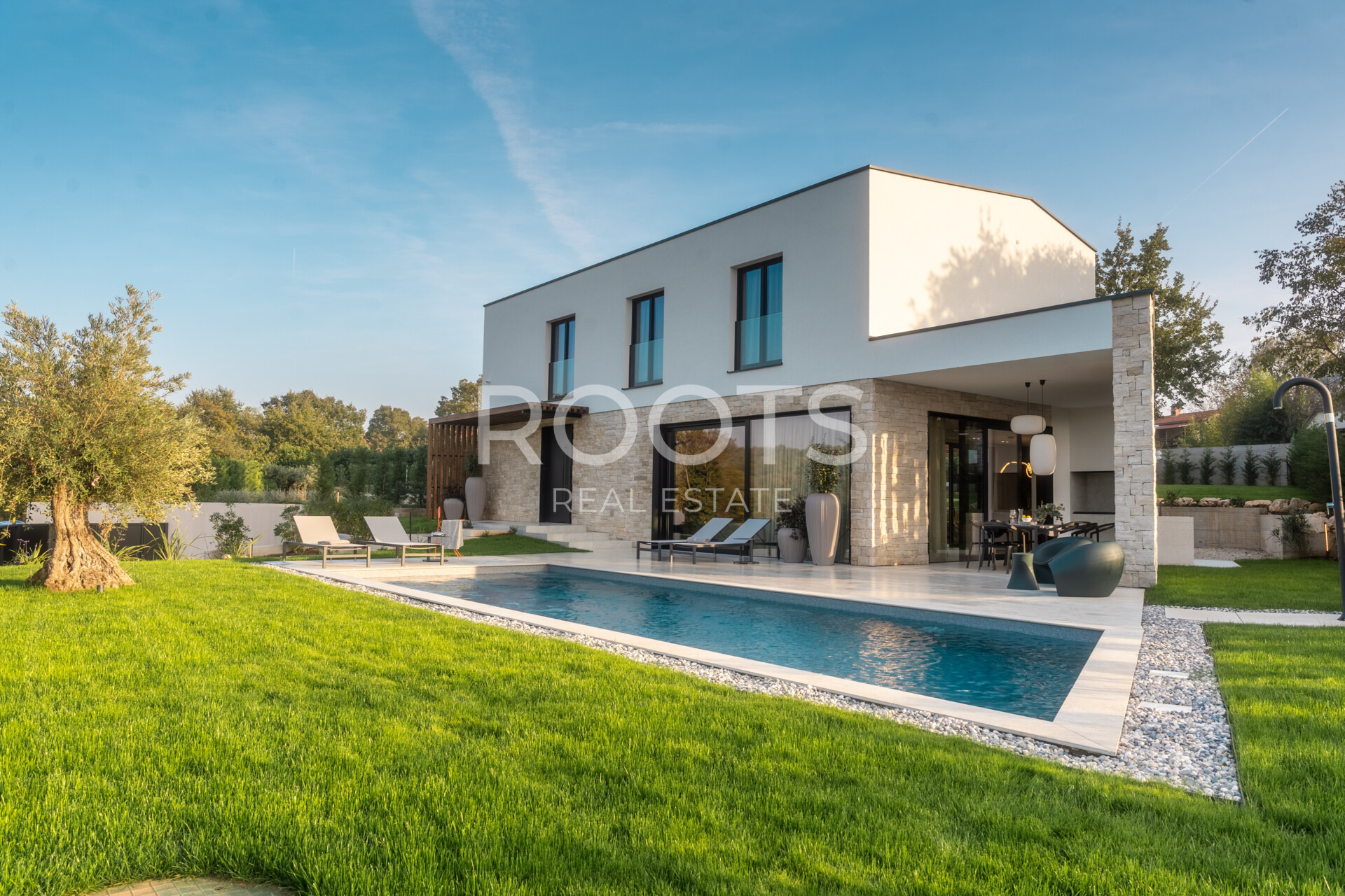 Istra, Marasi, izuzetna i moderna, kompletno dizajnerski namještena vila od 225 m2 sa bazenom s uređenom hortikulturom i 2 natkrivena parking mjesta.