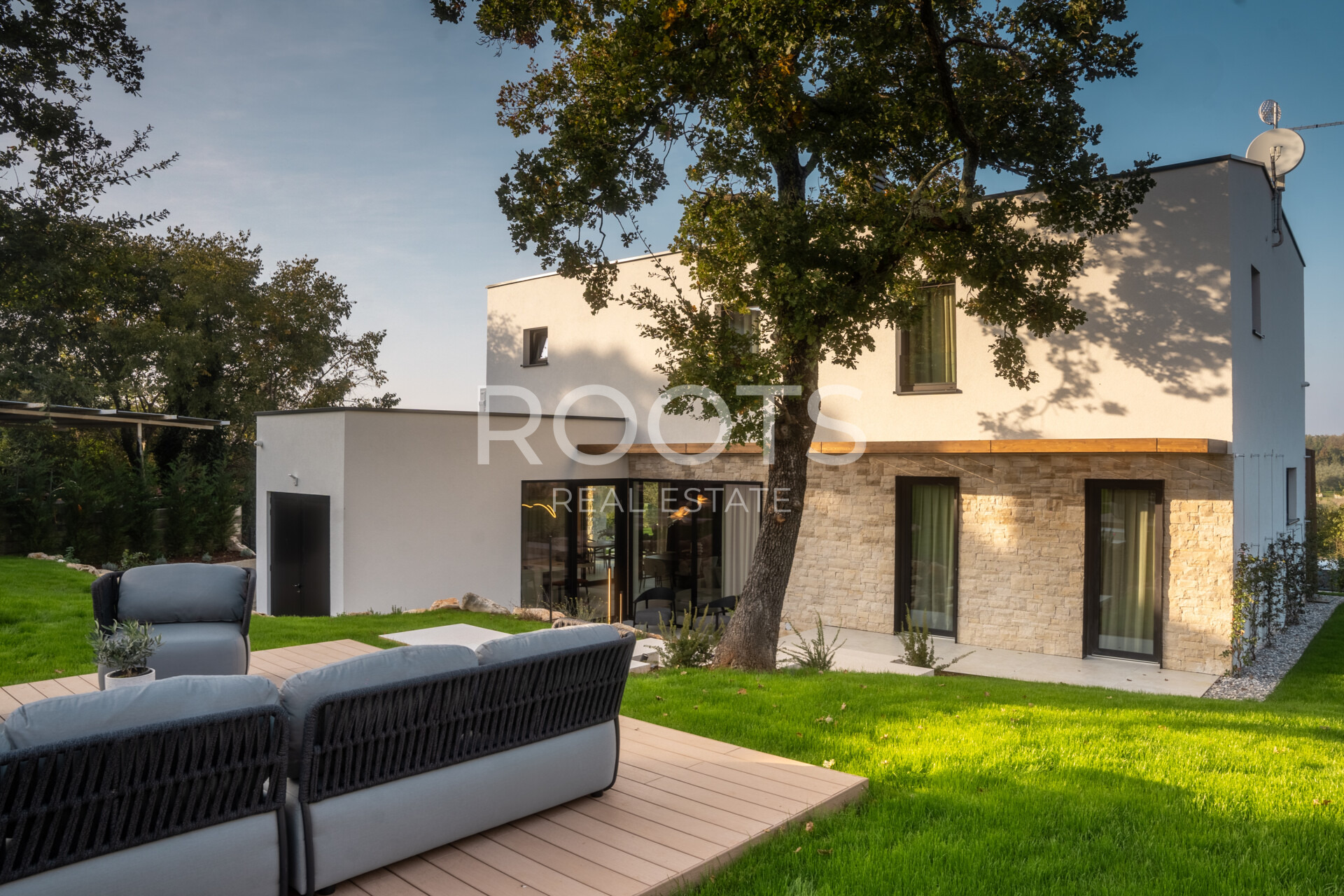Na rubu građevinske zone, u mirnom istarskom okruženju s otvorenim pogledom na maslinike, voćnjake i more, izgrađena na prostranoj parceli od 1.000 m².
