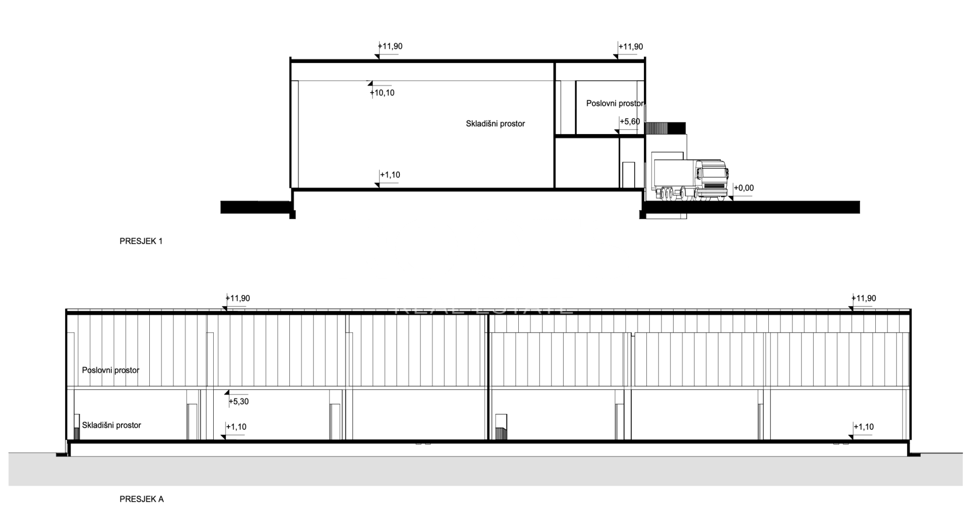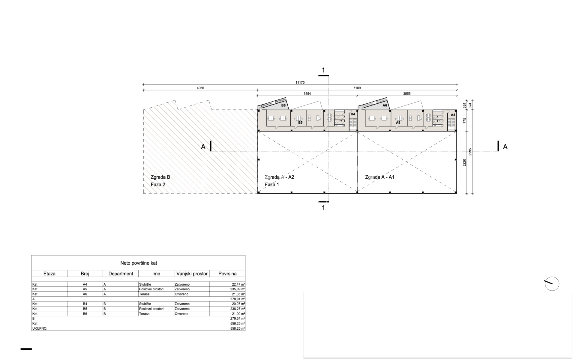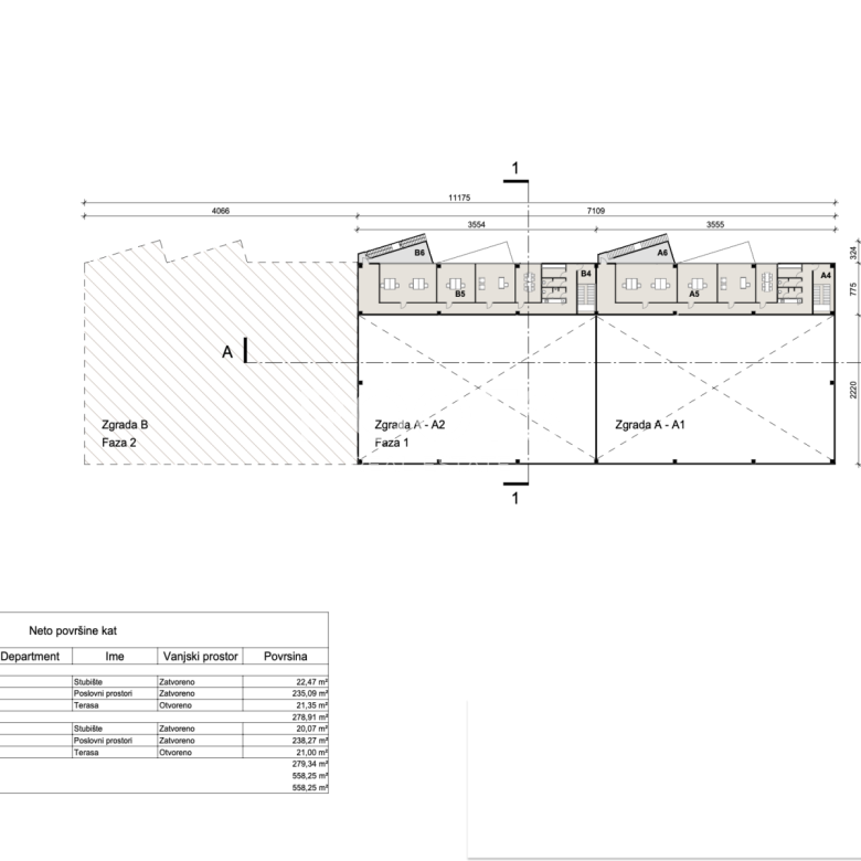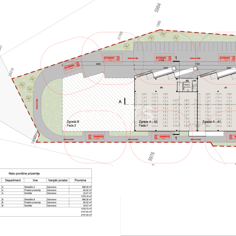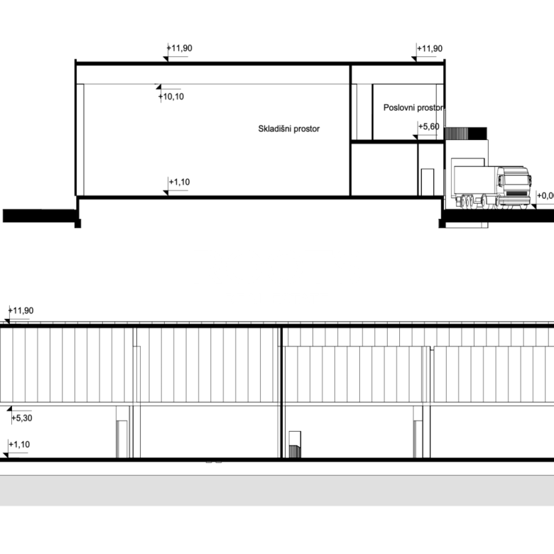 Projekt uključuje 2200 m2 skladišnog prostora, cca 160 m2 pripadajućih prostorija ( ured, 2 wc-a, garderoba, stubište ) u prizemlju te 400 m2 uredskog poslovnog prostora ( uredi, kuhinja, wc-i) na prvoj etaži. Visina hale 12 metara.
