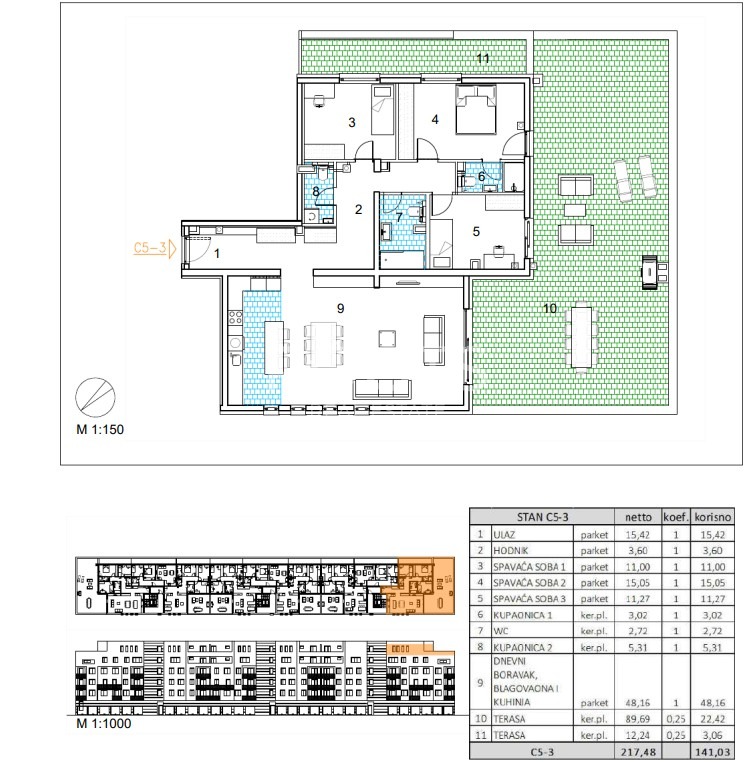Stan C5-3 – četverosoban penthouse na petom katu zatvorene površine 115,55 m2 s dvije terase 89,69 m2 i 12,24 m2.