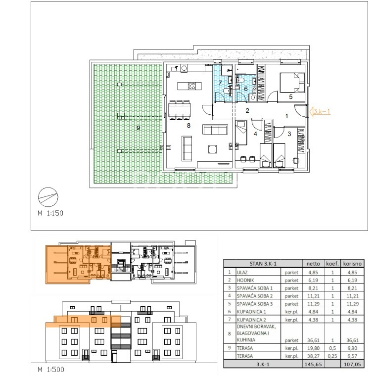 Stan 3K-1 – četverosoban stan na trećem katu zatvorene površine 87,58 m2 s natkrivenim dijelom terase 19,80 m2 i nenatkrivenim dijelom terase 38,27 m2.