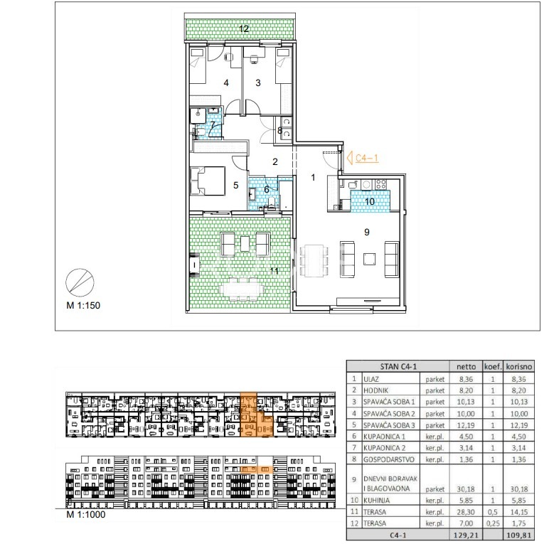 Stan C4-1 – četverosoban stan na četvrtom katu zatvorene površine 93,91 m2 s natkrivenom terasom 28,30 m2 i nenatkrivenom terasom 7,00 m2.