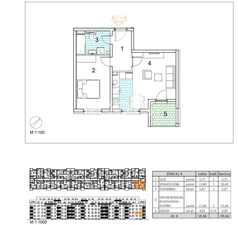 Stan A1-4 – dvosoban stan na prvom katu zatvorene površine 46,64 m2 s loggiom 4,02 m2.