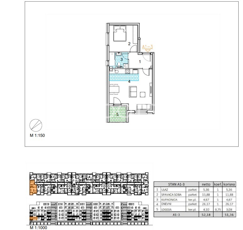 Stan A1-3 – dvosoban stan na prvom katu zatvorene površine 48,08 m2 s loggiom 4,10 m2.