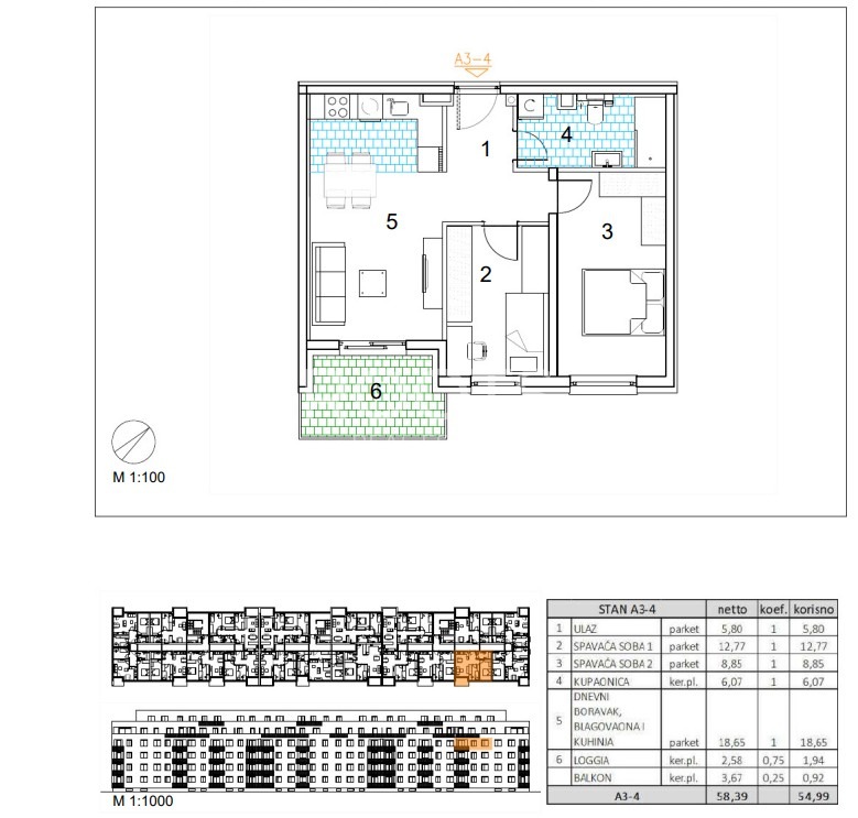 Stan A3-4 – trosoban stan na trećem katu zatvorene površine 52,14 m2 s loggiom 2,58 m2 i natkrivenim balkonom 3,67 m2.
