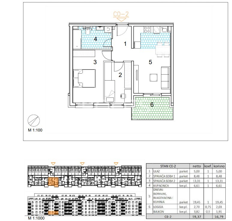 Stan C0-2 – trosoban stan u prizemlju zatvorene površine 52,85 m2 s loggiom 2,70 m2 i natkrivenim balkonom 3,82 m2.