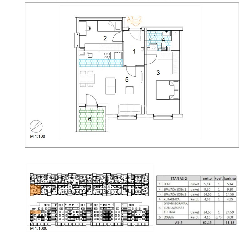 Stan A3-2 – trosoban stan na trećem katu zatvorene površine 58,05 m2 s loggiom 4,10 m2.