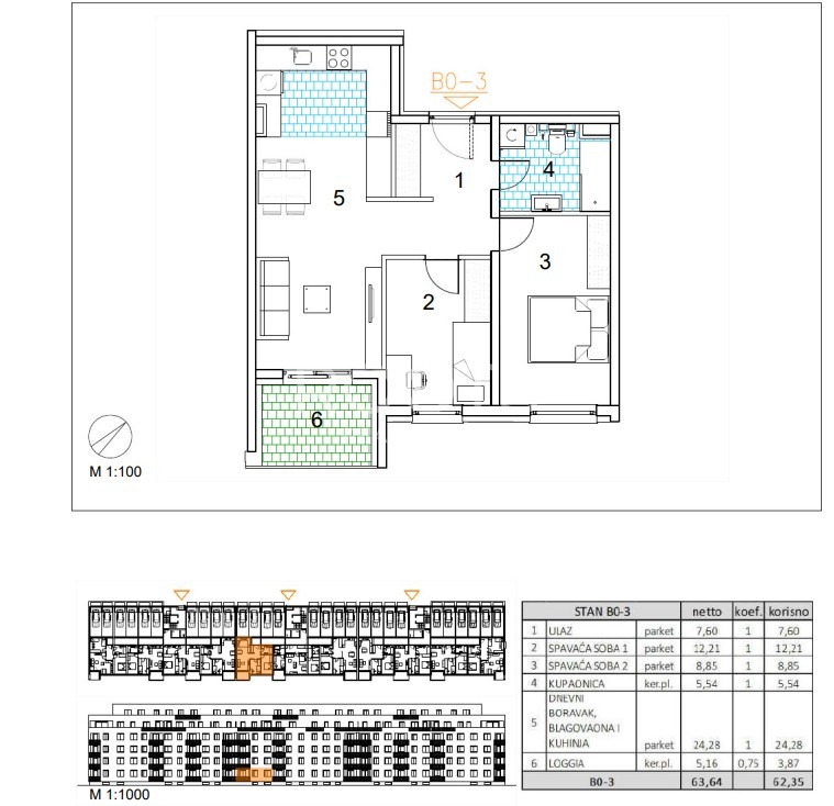Stan B0-3 – trosoban stan u prizemlju zatvorene površine 58,48 m2 s loggiom 5,16 m2.