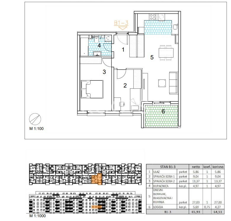 Stan B1-3 – trosoban stan na prvom katu zatvorene površine 60,24 m2 s loggiom 5,69 m2.