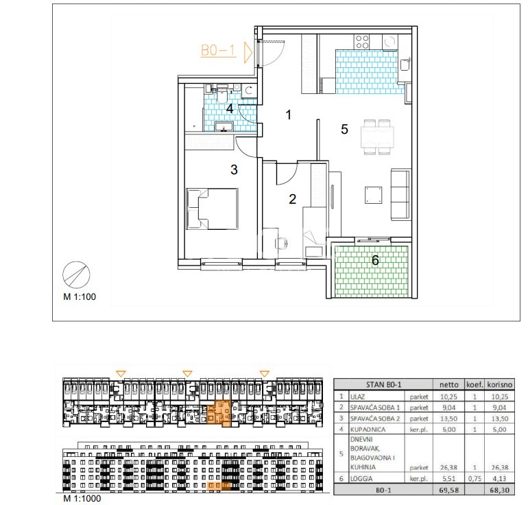 Stan B0-1 – trosoban stan u prizemlju zatvorene površine 64,07 m2 s loggiom 5,51 m2.