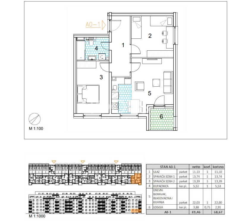 Stan A0-1 – trosoban stan u prizemlju zatvorene površine 65,76 m2 s loggiom 3,88 m2.