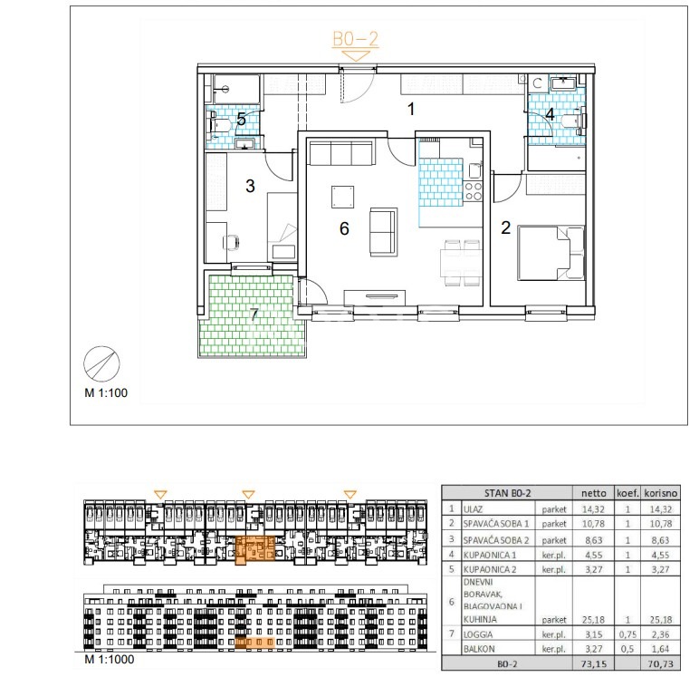 Stan B0-2 – trosoban stan u prizemlju zatvorene površine 66,73 m2 s loggiom 3,15 m2 i natkrivenim balkonom 3,27 m2.