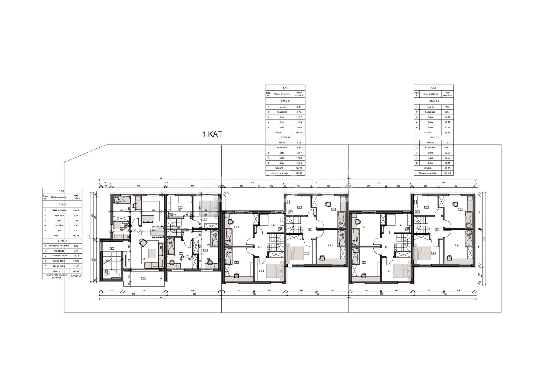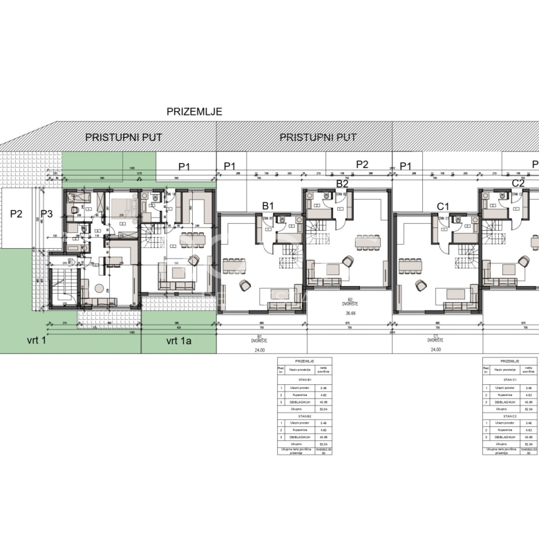 Kuća B1 – sastoji se od donje etaže ukupne površine 52,04 m2: ulaznog prostora 3,48 m2, kupaonice 4,62 m2, kuhinje, blagovaone i dnevnog boravka površine 43,95 m2 s izlaskom na vrt 24 m2, gornje etaže ukupne površine 50,74 m2: hodnika 7,61 m2, kupaonice 6,64 m2, tri spavaće sobe površina 12,97 m2, 12,99 m2 i 10,54 m2, te vanjsko parkirno mjesto 12,5 m2.