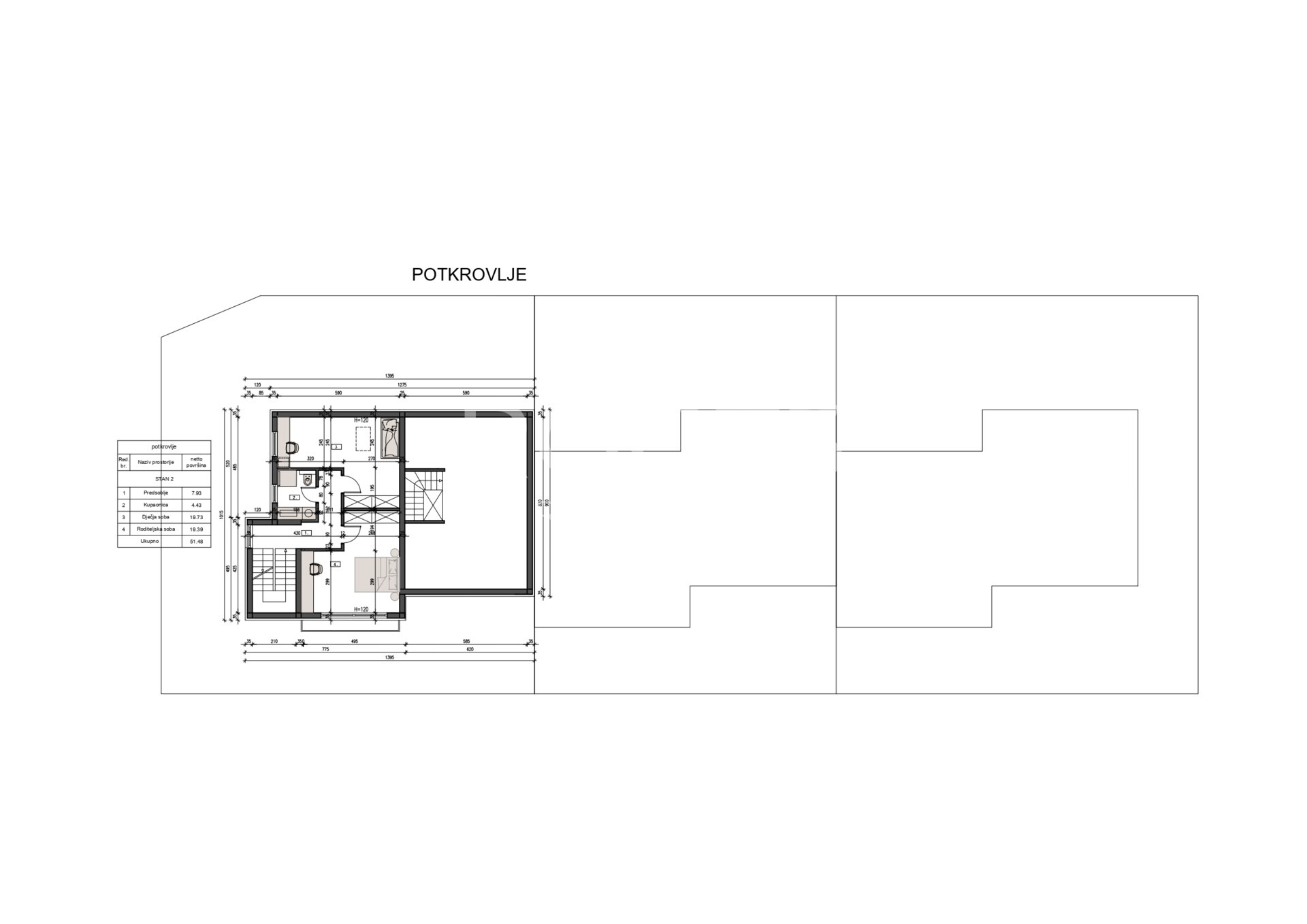 Predviđene zatvorene površine od 103 m2, razvedene u dvije etaže, pri čemu se prva etaža sastoji od ulaznog prostora, kupaonice, kuhinje, blagovaone i dnevnog boravka s izlaskom na vrt, te druga etaža koja se sastoji od predsoblja, tri spavaće sobe i kupaonice.