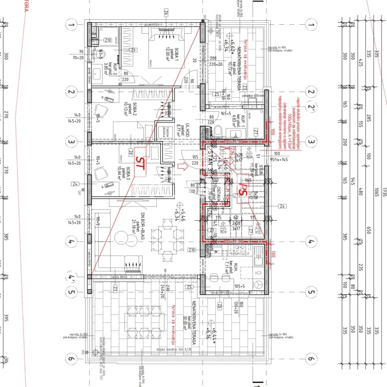 Stan S3 penthouse na drugom katu novogradnje, ulazni hodnik i veliki open space dnevni boravak sa prekrasnom terasom na zelenilo, spavaći dio sa 3 sobe i 2 kupaonice. Stanu pripadaju 2 parking mjesta u garaži svaki cca 15 m2.