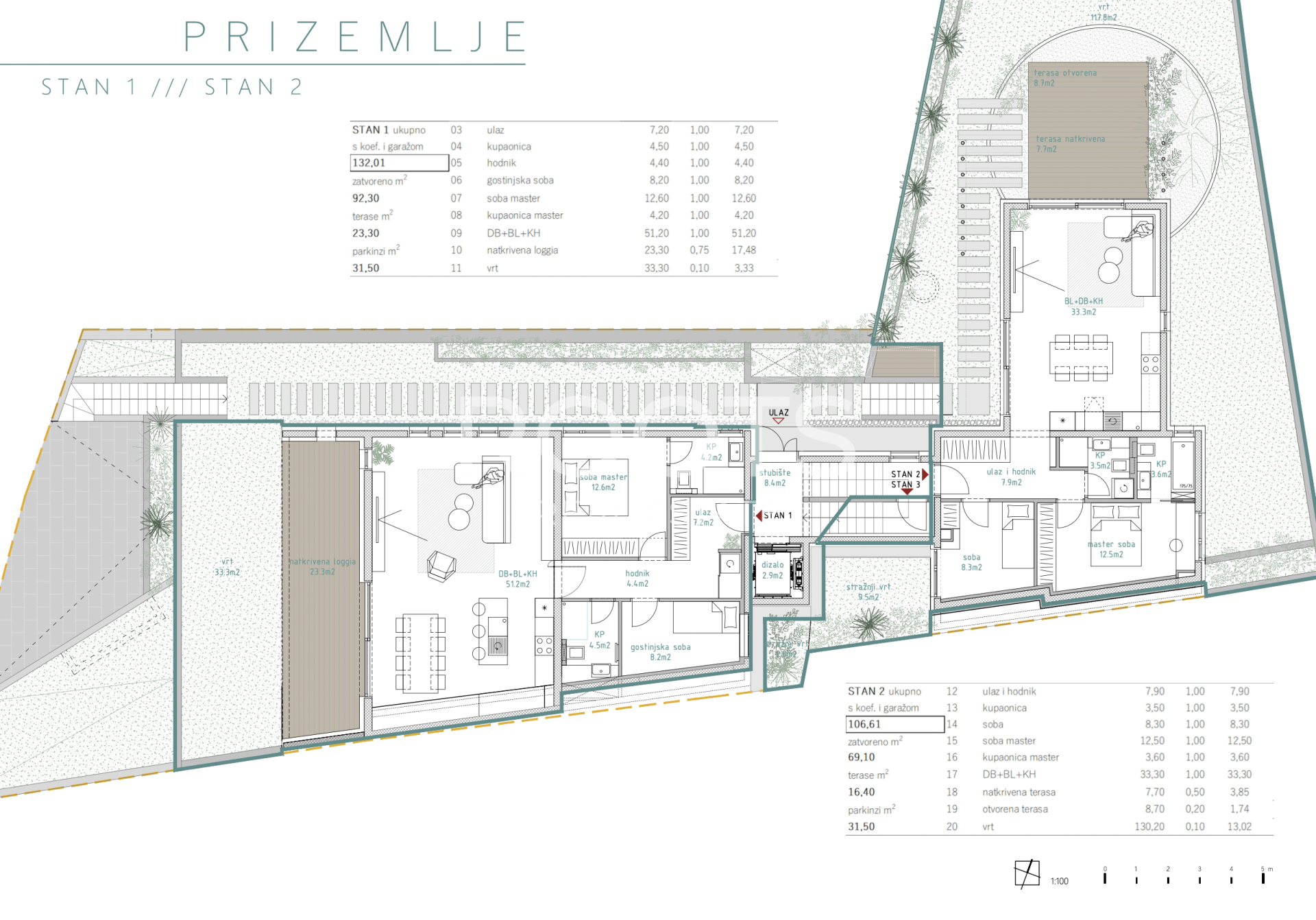 STAN 2 – trosoban stan zatvorene površine 69,10 m2 na 1. katu s dvije spavaće sobe, dvije kupaonice, velikim dnevnim prostorom ( 33,3m2 ) i izlazom na terasu ( 16,4 m2) i vrt ( 117 m2 ). Stanu pripada zatvorena garaža za 2 automobila ( 31,5 m2 ). Ukupno 107 m2 prodajne površine.