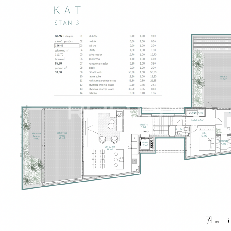 STAN 3 – trosoban penthouse zatvorene površine 112,7 m2 na 2. katu s dvije spavaće sobe, dvije kupaonice, velikim dnevnim prostorom (55,3m2) i i izlaznom na dvije prekrasne terase s predivnim pogledom (ukupno 85 m2). Stanu pripada zatvorena garaža za 2 automobila (31,5 m2). Ukupno 166,46 m2 prodajne površine.