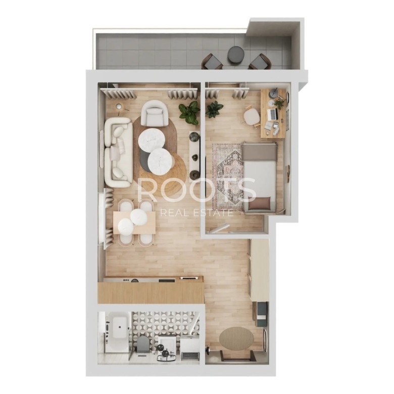 Stan se sastoji od ulaznog hodnika, prostranog dnevnog boravka s kuhinjom i blagovaonicom otvorenog koncepta s izlazom na balkon, jedne spavaće sobe i kupaonice.