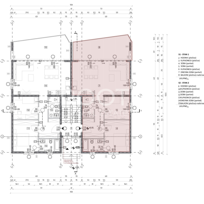 Stan S3 na drugom katu – 71 m2 stambenog prostora, s prekrasnom terasom od 20 m2, garažnim parking mjestom i vanjskim parking mjestom. Ukupna prodajna površina cca 94,2 m2. Tlocrti su maksimalno iskorišteni, ulazni hodnik, 2 spavaće sobe, 2 kupaonice, veliki dnevni dio sa otvorima i loggia-ma.
