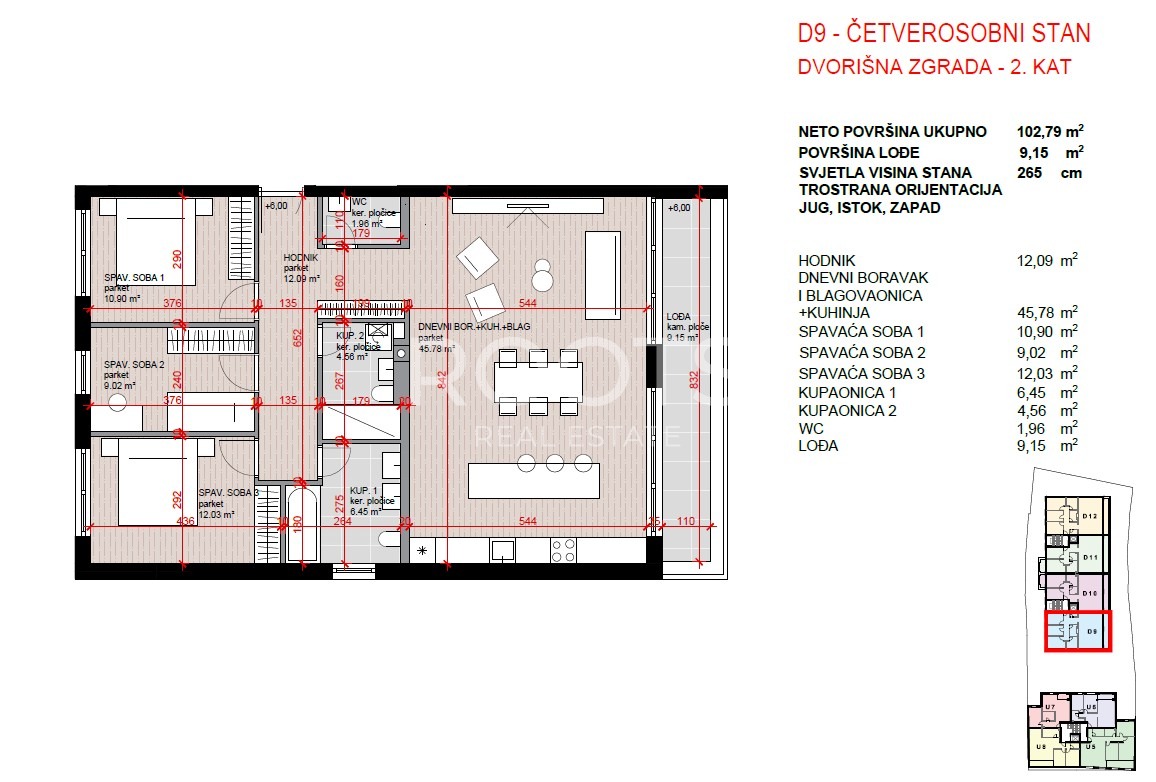 STAN D-9, četverosoban stan na drugom katu, ukupno 110 m2 neto prodajne površine.