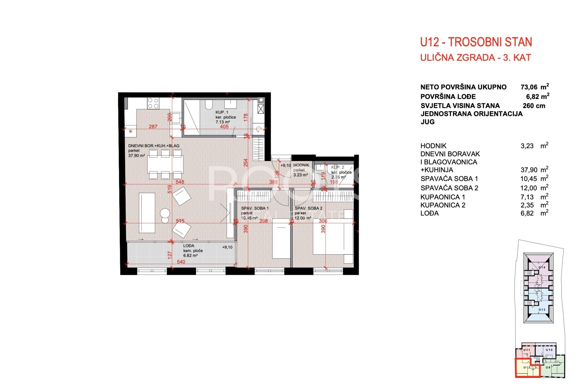 STAN U-12, četverosoban na 3. katu, ukupno 78 m2 neto prodajne površine.