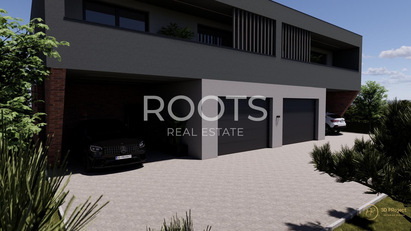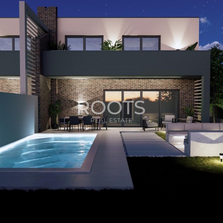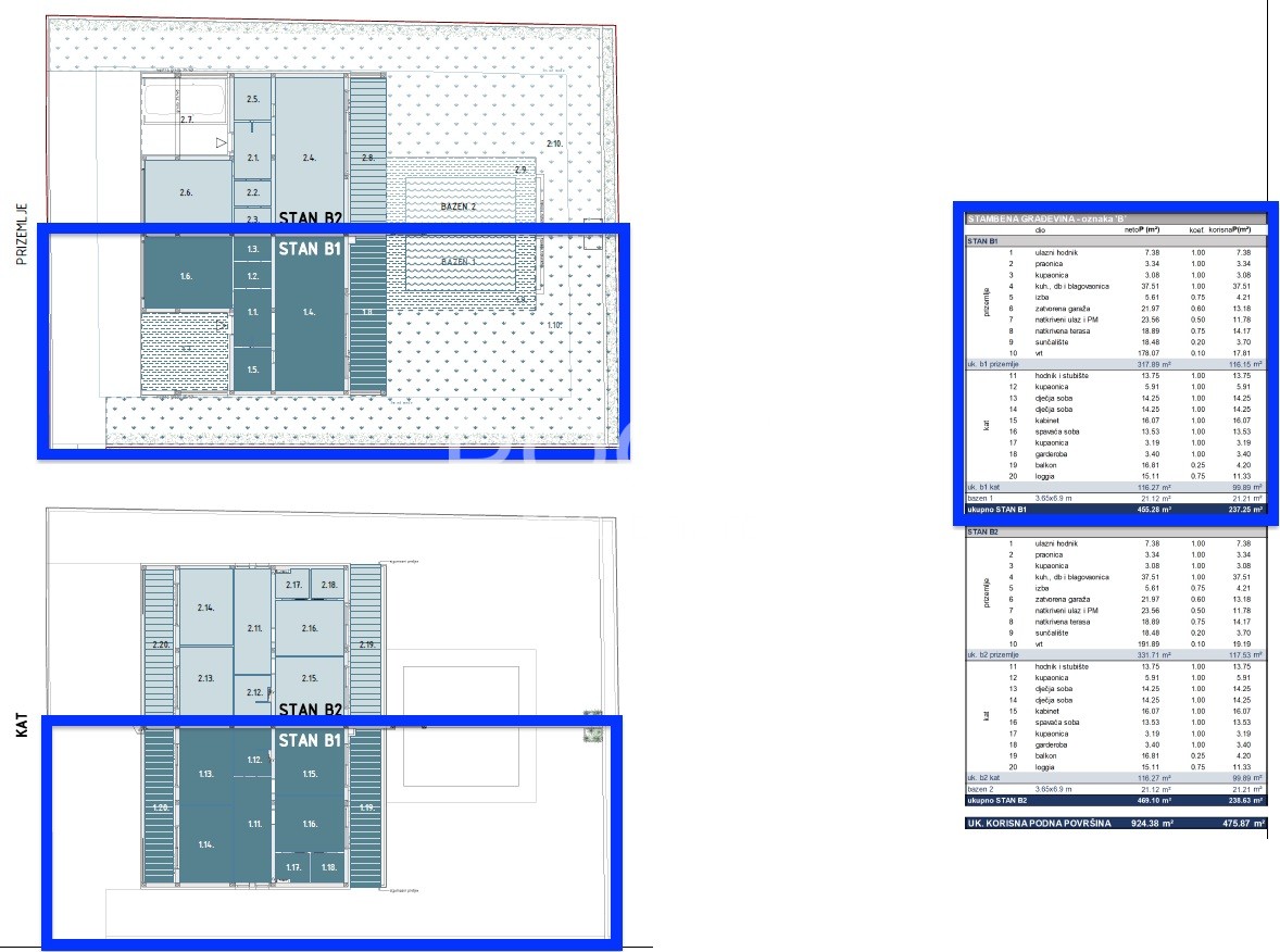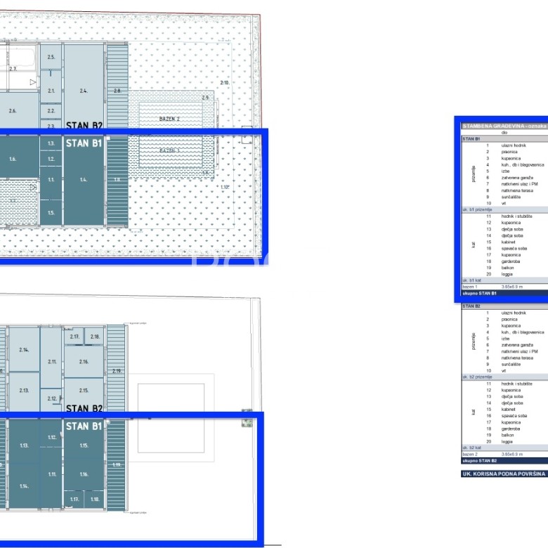 Kuća B1 – zatvorene površine 200 m2 sa bazenom 3,6 x 6,9 m, uređenom okućnicom 190 m2, natkrivenom terasom 19 m2, balkonom 17 m2 i loggiom 15 m2.