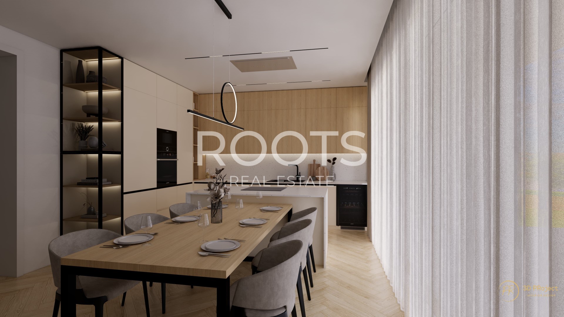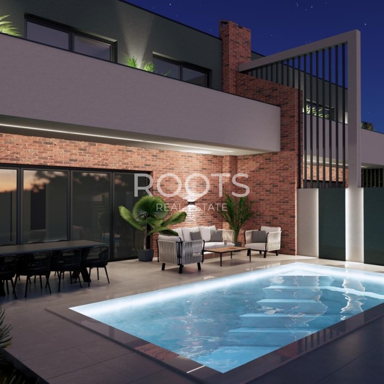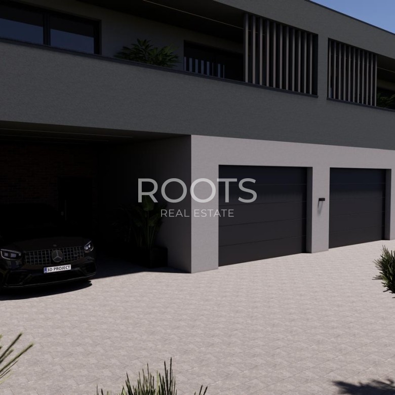 Tlocrt razveden u dvije etaže, prva etaža se sastoji natkirvenog parkinga, zasebne garaže i ulaznog hodnika, kuhinje, blagovaone i dnevnog boravka sa izlazom na vrt i privatni bazen dok se na drugoj etaži nalaze četiri komforne spavaće sobe i tri kupaonice.
