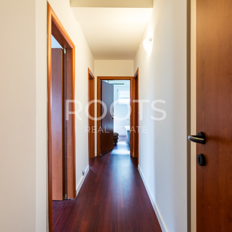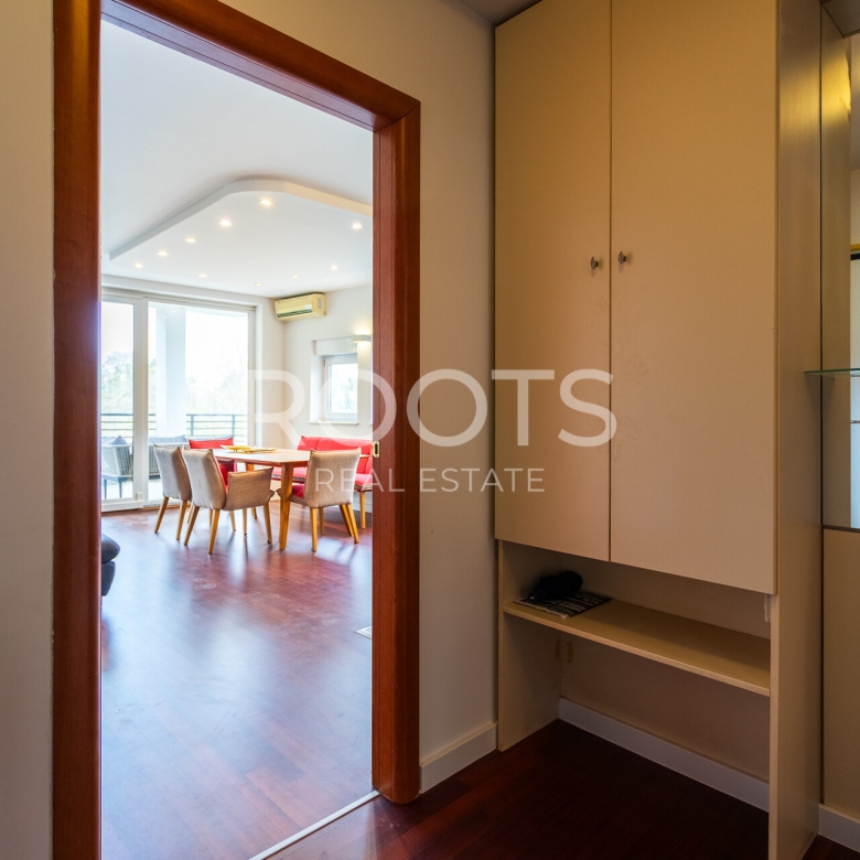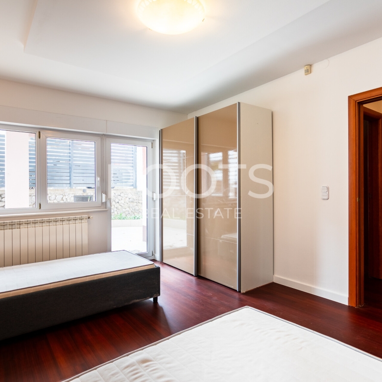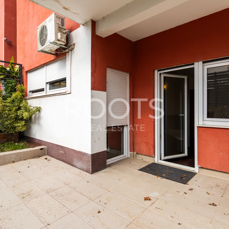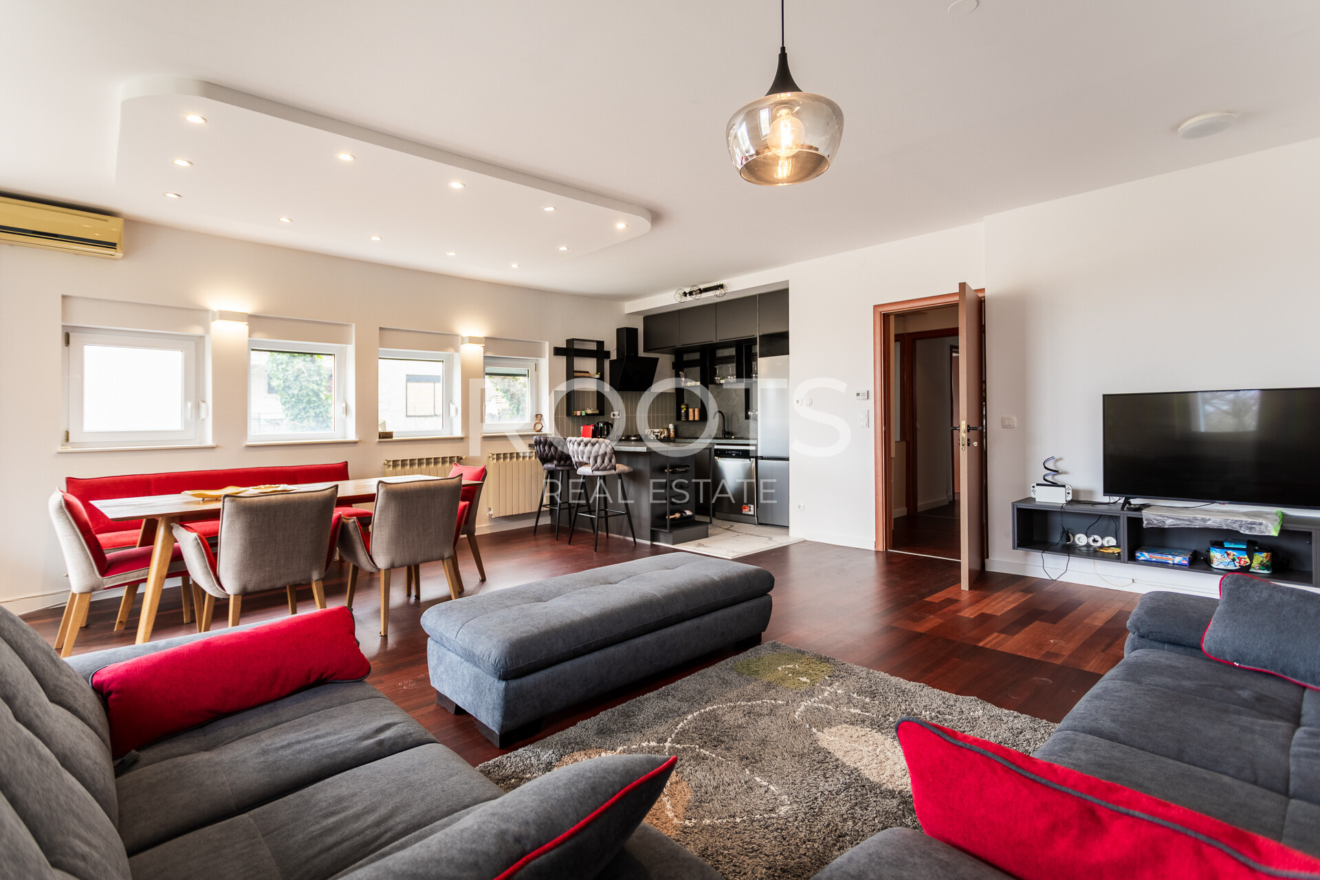 Stan se sastoji od ulaznog prostora, prostranog dnevnog boravka s blagovaonicom i kuhinjom otvorenog koncepta te velike natkrivene terase. U privatnom dijelu stana nalaze se tri komforne spavaće sobe s izlazom na mali vrt/terasu te nova kupaonica. Stan je kompletno adaptiran ove godine.