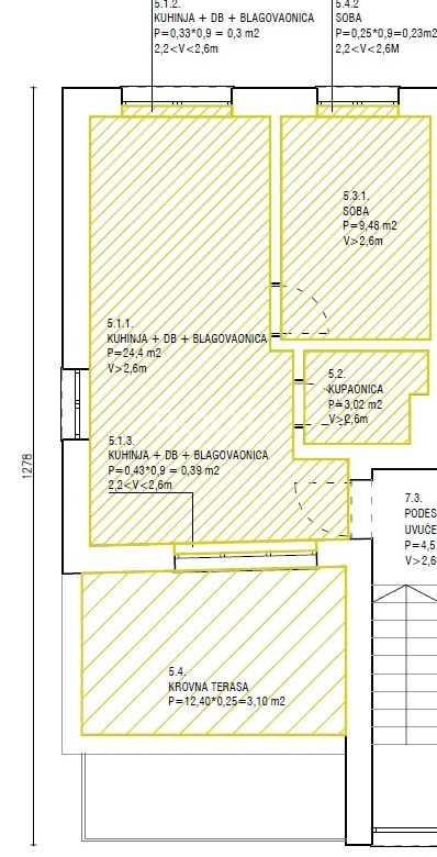 STAN S5 – dvosoban stan na uvučenom katu zatvorene površine 37,9 m2 sa terasom od 12,4 m2 i vanjskim parking mjestom 12,5 m2. Ukupne prodajne kvadrature 43,4 m2.