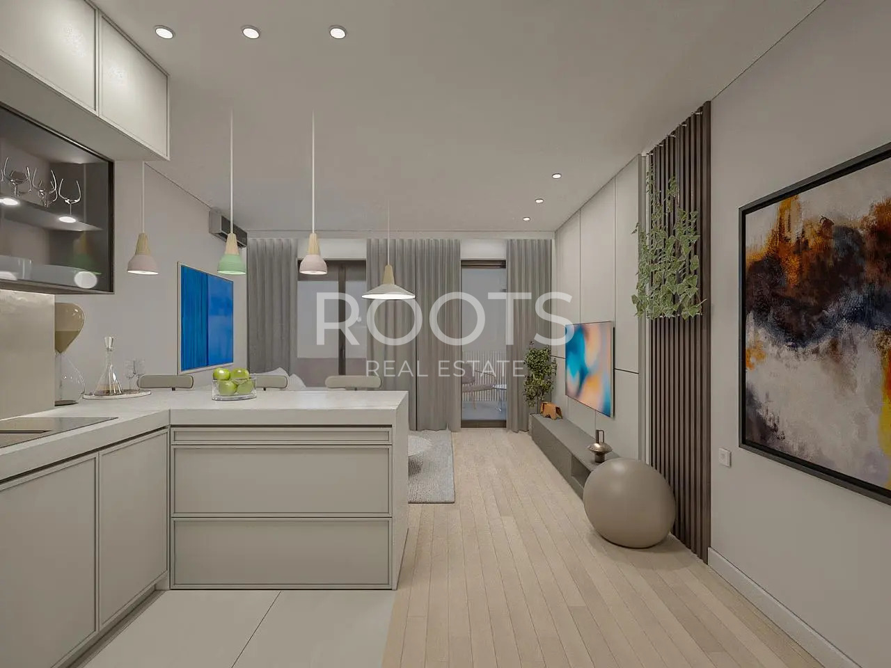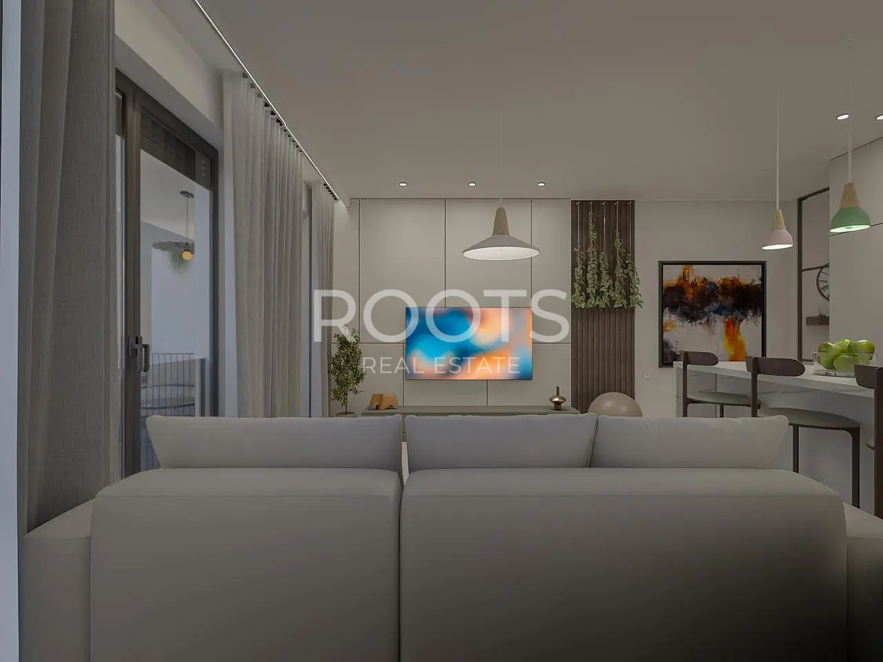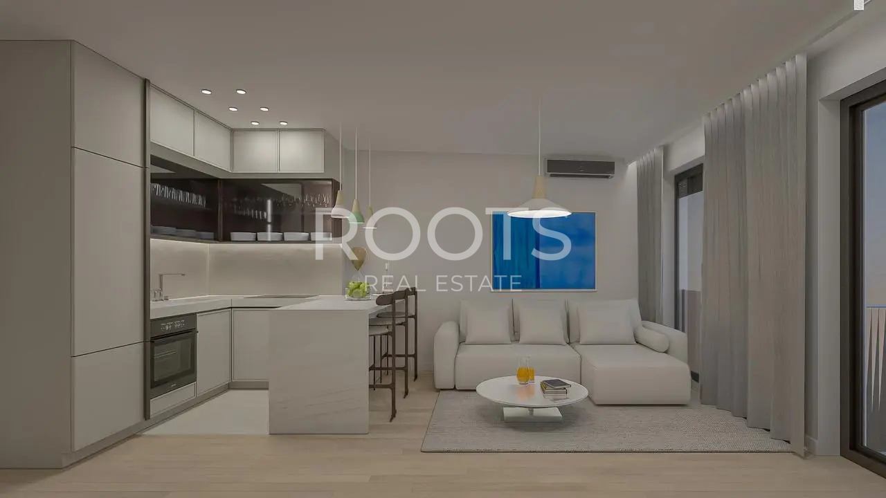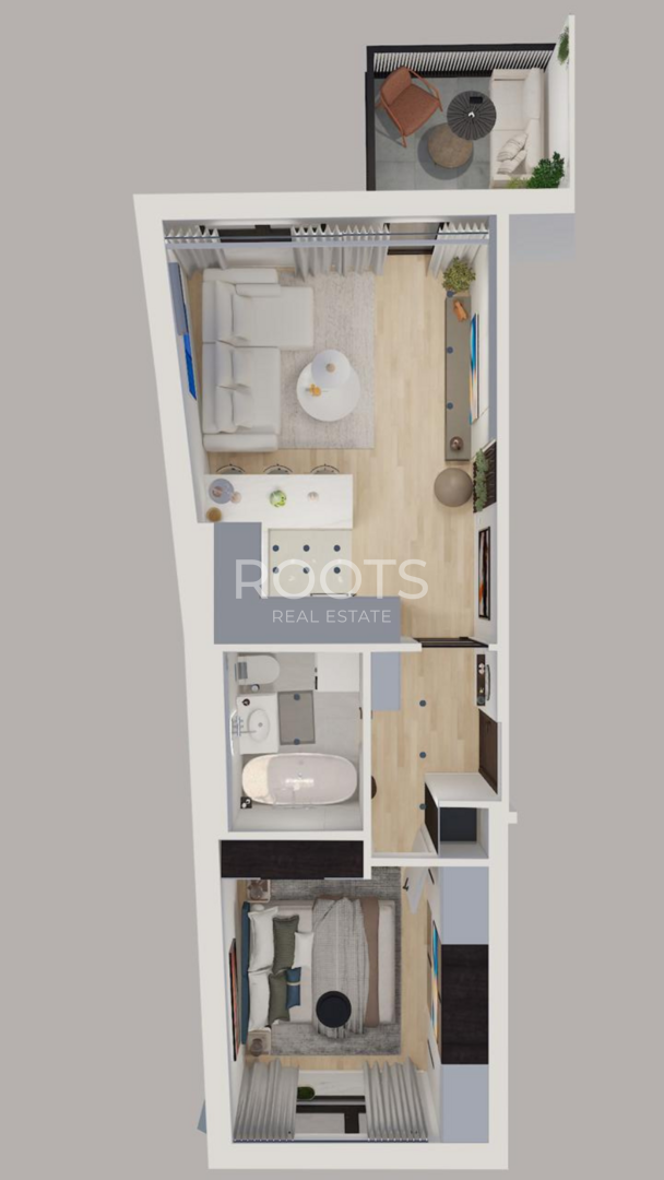 Kvalitetno iskorišten tlocrt, sastoji se od ulaznog hodnika, kuhinje i dnevnog boravka s izlaskom na natkriveni balkon, spavaće sobe i kupaonice.