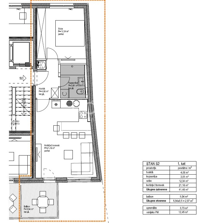 Stan S2 – trosoban stan na prvom katu, zatvorene površine 41,46 m2 s balkonom 5,94 m2, spremištem 3,73 m2 i vanjskim parkirnim mjestom.