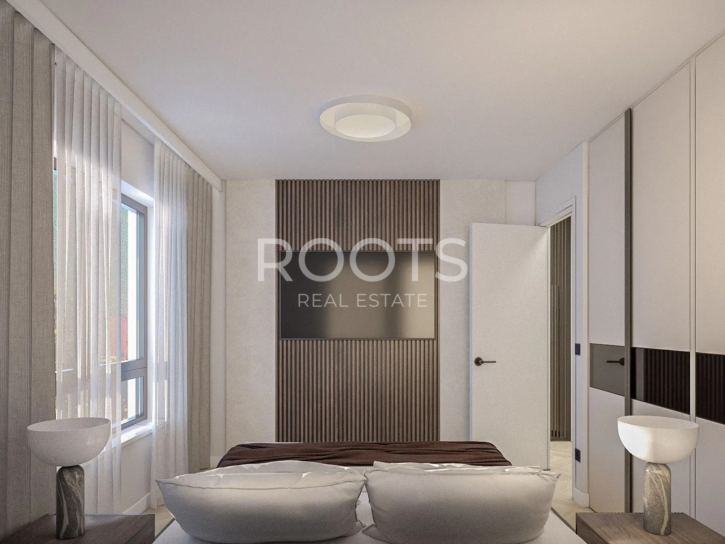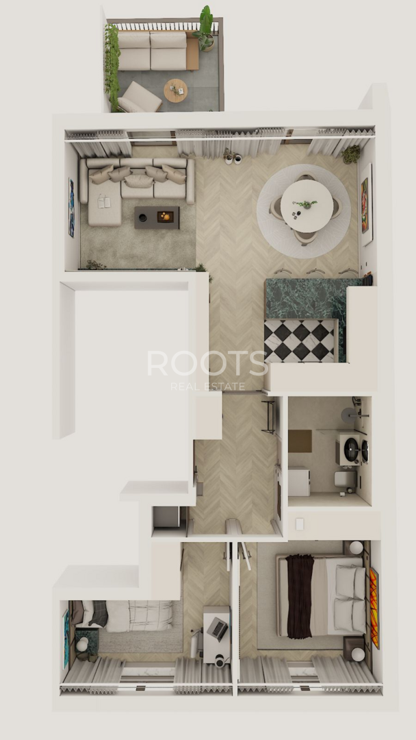Kvalitetno iskorišten tlocrt, sastoji se od ulaznog hodnika, kuhinje i dnevnog boravka s izlaskom na natkriveni balkon, dvije spavaće sobe i kupaonice.