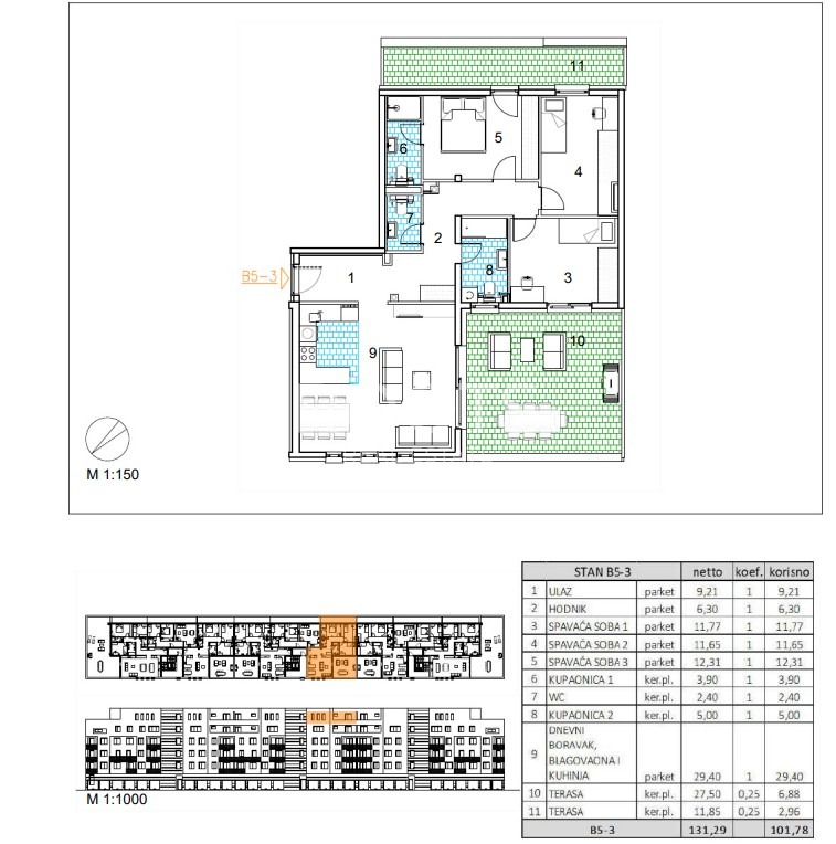 Stan B5-3 – četverosoban penthouse na petom katu zatvorene površine 91,94 m2 s dvije terase 27,50 m2 i 11,85 m2.