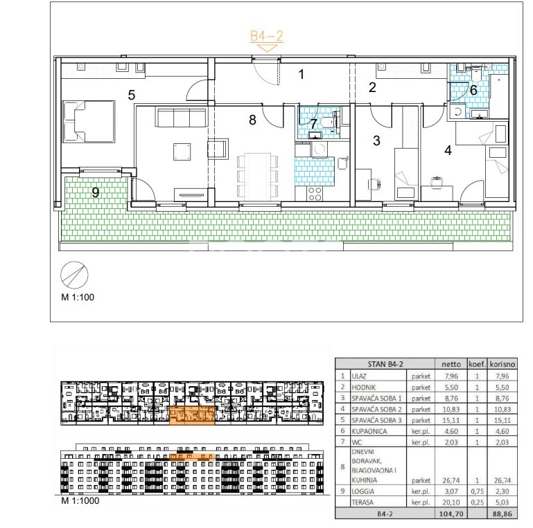 Stan B4-2 – četverosoban stan na četvrtom katu zatvorene površine 81,53 m2 s loggiom 3,07 m2 i nenatkrivenom terasom 20,10 m2.