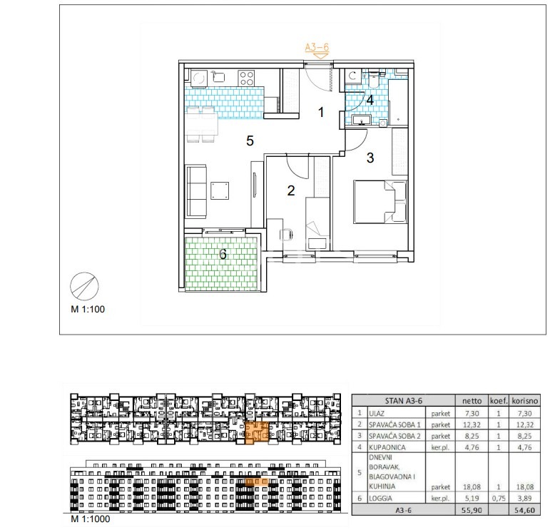 Stan A3-6 – trosoban stan na trećem katu zatvorene površine 50,71 m2 s loggiom 5,19 m2.