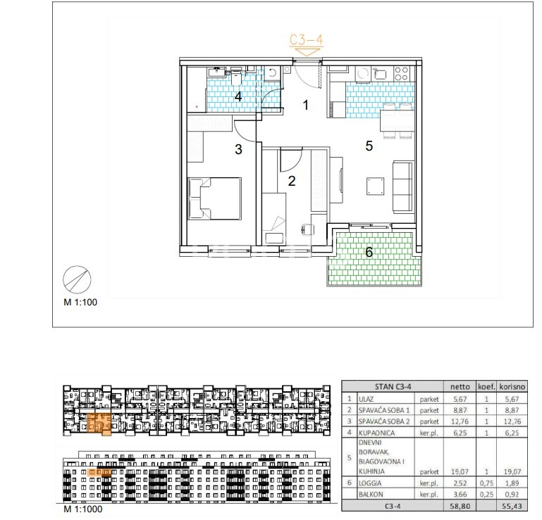 Stan C3-4 – trosoban stan na trećem katu zatvorene površine 52,62 m2 s loggiom 2,52 m2 i balkonom 3,66 m2.