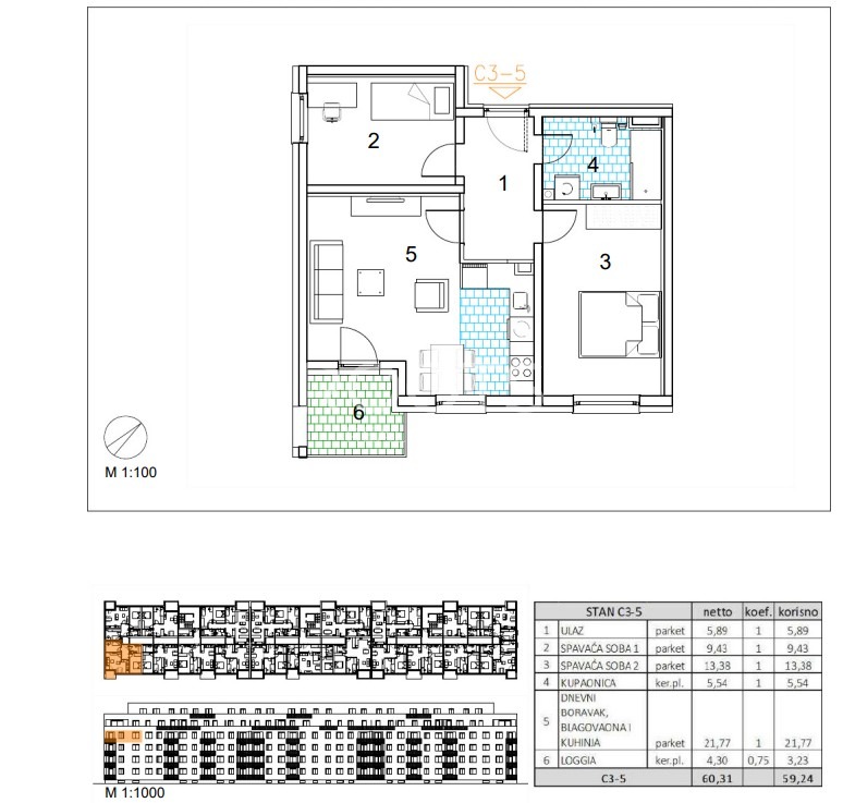 Stan C3-5 – trosoban stan na trećem katu zatvorene površine 56,01 m2 s loggiom 4,30 m2.