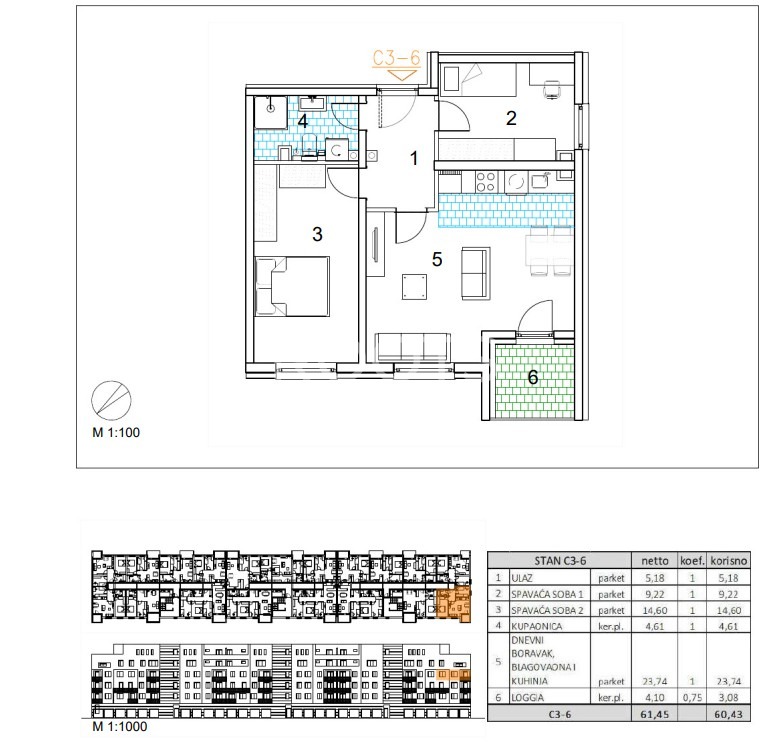 Stan C3-6 – trosoban stan na trećem katu zatvorene površine 57,35 m2 s loggiom 4,10 m2.