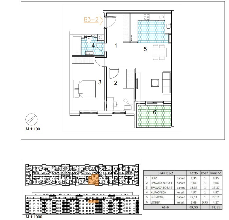 Stan B3-2 – trosoban stan na trećem katu zatvorene površine 63,84 m2 s loggiom 5,69 m2.
