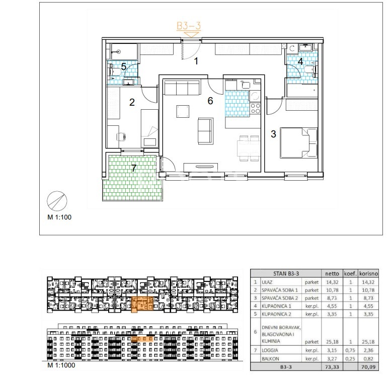 Stan B3-3 – trosoban stan na trećem katu zatvorene površine 66,91 m2 s loggiom 3,15 m2 i natkrivenim balkonom 3,27 m2.